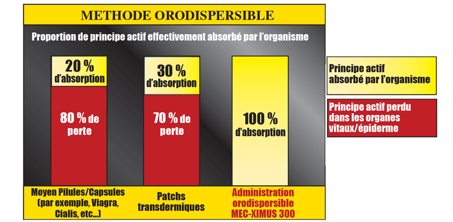 C’est vrai ; le MEC-XIMUS 300 est 300 % plus efficace que n’importe quelle autre méthode d’administration traditionnelle. C’est un fait bien connu dans le secteur médical : la méthode orodispersible est l’avenir, en raison de son efficacité.